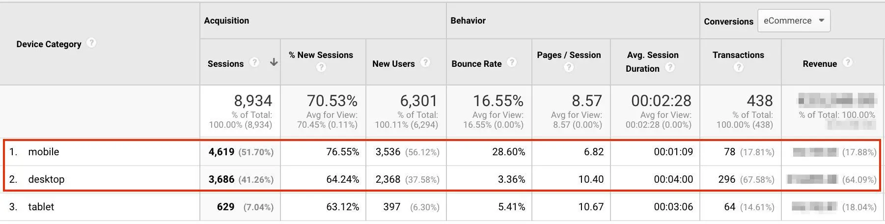 Örnek olarak bir e-ticaret sitesinin Google Analytics hesabından alınmış bu istatistiklere bakabilirsiniz. Mobilden gelen ziyaretçi sayısı fazla, ancak satın almalar masaüstüne kıyasla daha düşük.