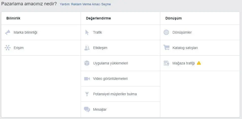 Eğer daha önceden ürün kataloğunuzu Facebook’a yüklediyseniz alternatif olarak “Dönüşüm”ü de pazarlama amacı olarak belirleyebilirsiniz.