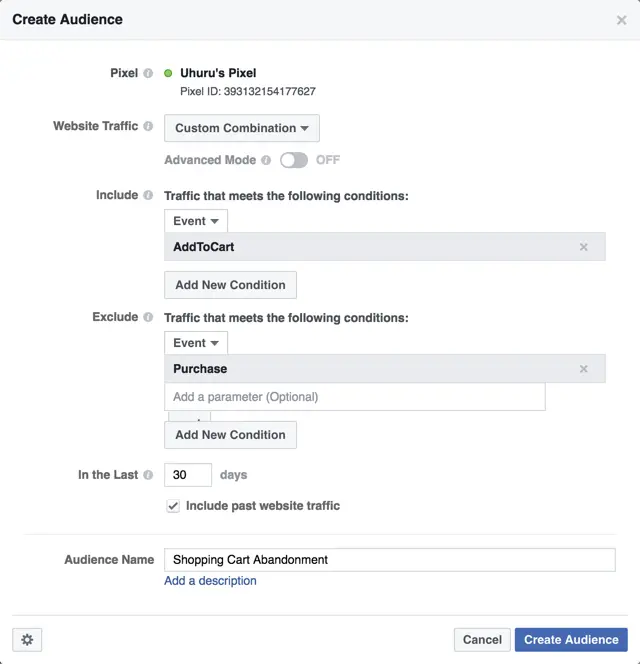 Şayet hedef kitle ayarlarını yukarıdaki gibi yaparsanız ürünü sepete ekleyip siparişi tamamlamadan ayrılan kullanıcılara reklam gösterimi yapabilirsiniz. “AddToCart” eylemini ekleyip “Purchase” eylemini hariç tutup kitle oluşturduktan sonra yayınlayacağınız reklamın geri dönüş oranı kuşkusuz daha yüksek olacaktır.