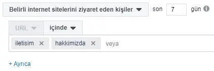 “Tüm internet sitesi ziyaretçileri” seçeneğine ek olarak “Belirli internet sitelerini ziyaret eden kişiler”i işaretlediğiniz takdirde sitenizin “İletişim” ve “Hakkımızda” gibi sabit sayfalarını tıklayıp hakkınızda bilgi edinmeye çalışan ziyaretçileri hedef alabilirsiniz. Bu kişiler satın almaya daha eğilimli olacaklardır.
